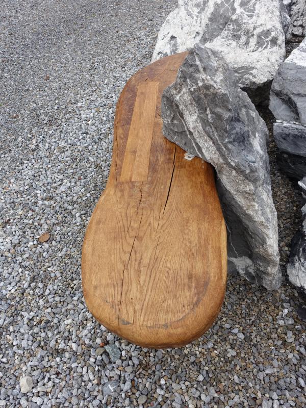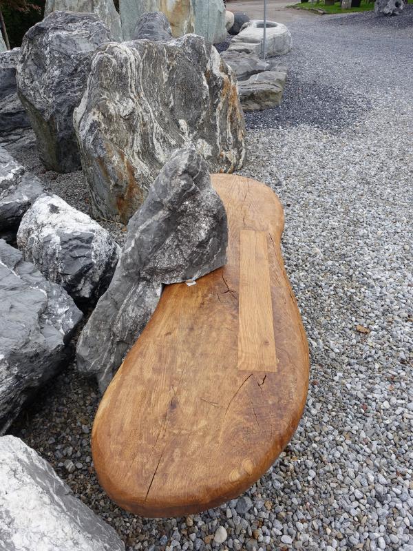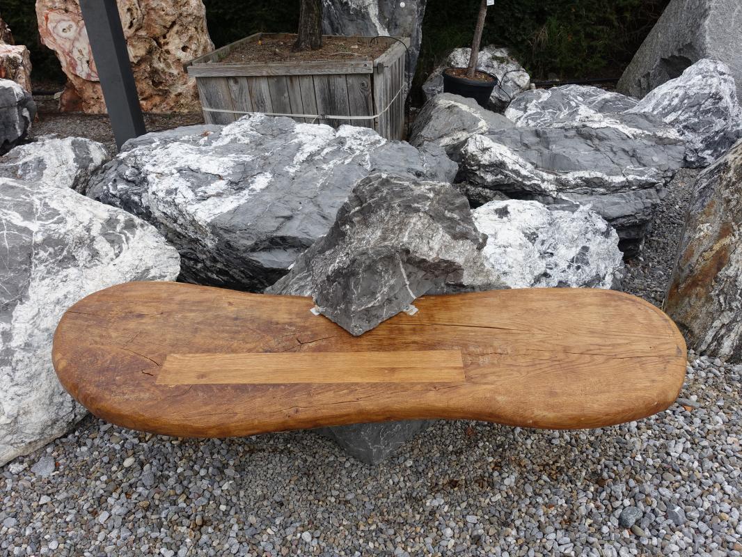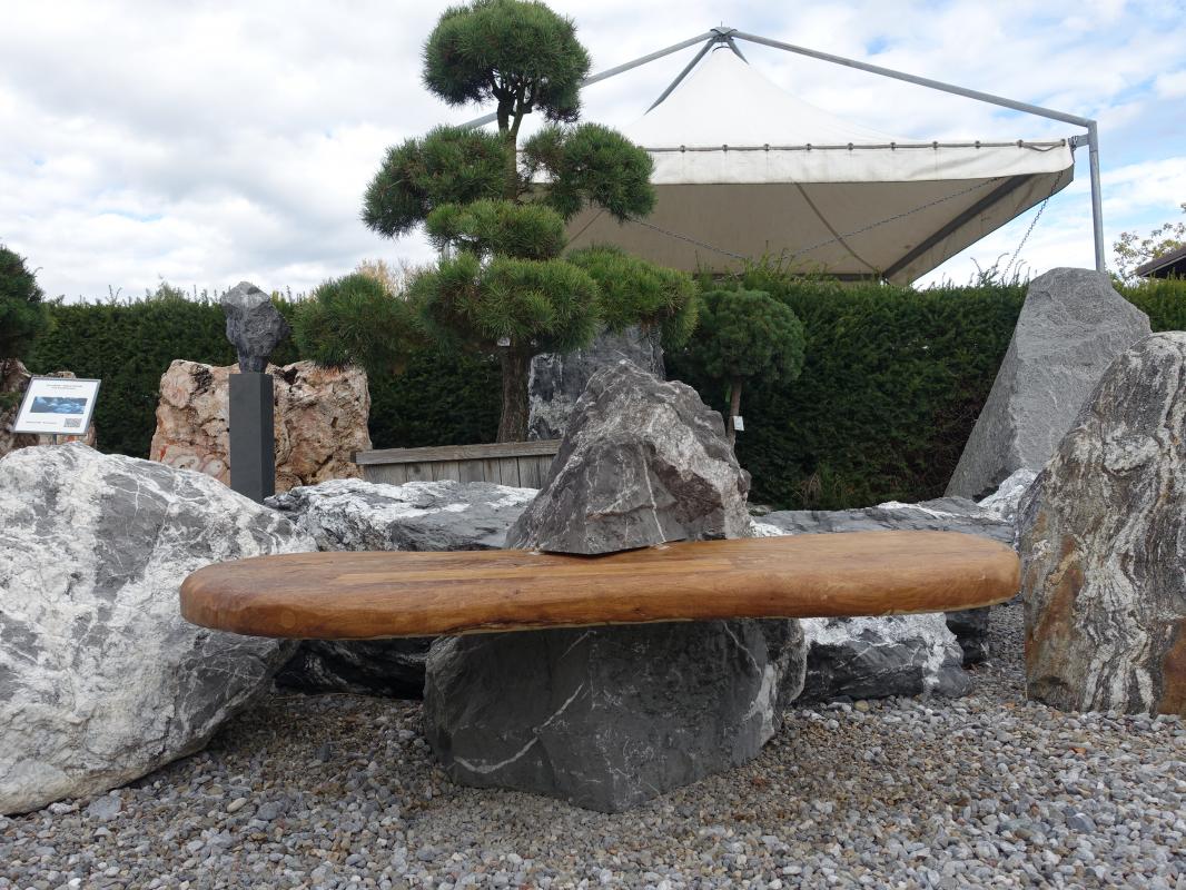 Mit feiner Oberfläche, lädt die Gartenbank aus einem Findling und Holz den ganzen Tag zum Verweilen ein.